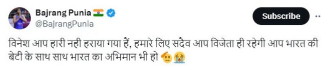 पहलवान बजरंग पूनिया ने विनेश फोगाट की हौसलाअफजाई करते हुए कहा कि वे नहीं हारीं, बल्कि हराई गईं। उन्होंने ट्वीट किया, “विनेश, आप हारी नहीं हैं, बल्कि हराई गई हैं। हमारे लिए आप सदैव विजेता रहेंगी। आप भारत की बेटी और भारत का गर्व हैं।”