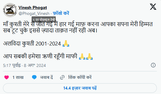 भारतीय रेसलर विनेश फोगाट ने पेरिस ओलंपिक 2024 में डिस्क्वालिफाई होने के बाद कुश्ती से संन्यास का ऐलान किया है। गुरुवार सुबह 5:17 बजे X (पूर्व ट्विटर) पर एक भावुक पोस्ट में उन्होंने लिखा, “मां, कुश्ती ने मुझसे जीत लिया है, मैं हार गई हूं। आपके सपने और मेरी हिम्मत, सब टूट चुके हैं। अब और ताकत नहीं बची। अलविदा कुश्ती 2001-2024, मैं हमेशा आपकी ऋणी रहूंगी। माफ़ कीजिए।”