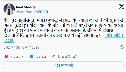 इस हृदयविदारक घटना पर केंद्रीय गृहमंत्री अमित शाह ने गहरा शोक व्यक्त किया। उन्होंने एक्स (पूर्व में ट्विटर) पर लिखा, “बीजापुर में हुए आईईडी ब्लास्ट में डीआरजी के वीर जवानों को खोने की सूचना अत्यंत दुखद है। उनके परिजनों के प्रति मेरी गहरी संवेदनाएं। यह बलिदान व्यर्थ नहीं जाएगा। हम मार्च 2026 तक भारत की भूमि से नक्सलवाद को समाप्त करके ही रहेंगे।”