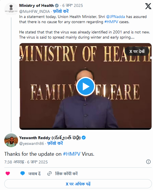 एचएमपीवी वायरस के मामलों को लेकर स्वास्थ्य मंत्रालय सतर्क है। केंद्रीय स्वास्थ्य मंत्री जेपी नड्डा ने कहा कि स्वास्थ्य मंत्रालय, आईसीएमआर और राष्ट्रीय रोग नियंत्रण केंद्र (NCDC) इस पर कड़ी निगरानी रख रहे हैं। साथ ही चीन और पड़ोसी देशों में भी इसके प्रसार पर नजर रखी जा रही है। उन्होंने बताया कि विश्व स्वास्थ्य संगठन (WHO) स्थिति पर ध्यान दे रहा है और जल्द ही अपनी रिपोर्ट साझा करेगा।