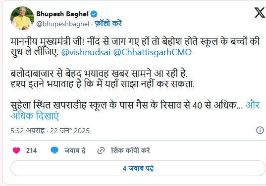 पूर्व मुख्यमंत्री भूपेश बघेल ने इस घटना को लेकर सरकार पर निशाना साधा। उन्होंने एक्स (पूर्व में ट्विटर) पर लिखा, “बलौदाबाजार से भयावह खबर सामने आ रही है। खपराडीह स्कूल के पास गैस रिसाव के कारण 40 से अधिक बच्चों की तबीयत खराब हो गई है। प्रशासन को समय रहते कदम उठाने चाहिए थे।”