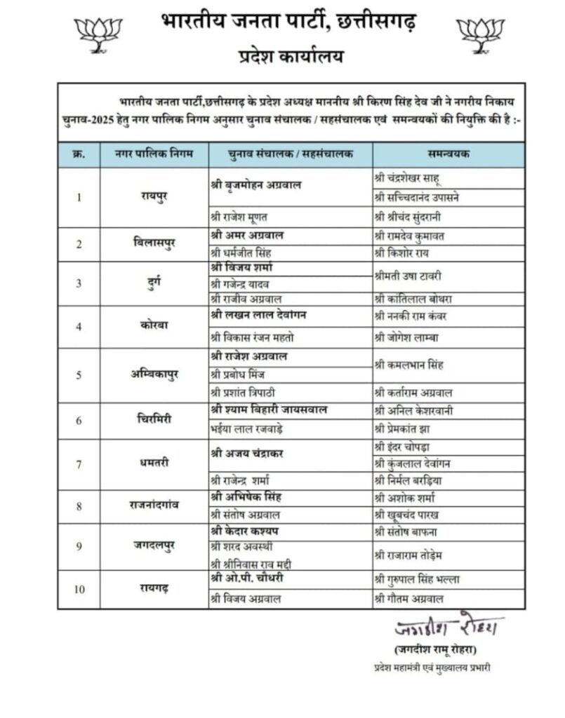 रायपुर (शिखर दर्शन) // भारतीय जनता पार्टी ने नगरीय निकाय चुनाव में पार्टी प्रत्याशियों की जीत सुनिश्चित करने के लिए विभिन्न निकायों के लिए चुनाव संचालक, सह संचालक और समन्वयकों की नियुक्ति की है। पार्टी के प्रदेश अध्यक्ष किरण सिंहदेव की ओर से यह नियुक्तियां की गईं हैं।