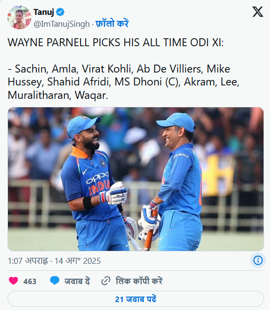 पार्नेल ने टीम चुनते समय किसी एक युग पर ध्यान नहीं दिया, बल्कि अलग-अलग समय के दिग्गजों को शामिल किया। उनकी इस टीम में भारत के तीन दिग्गज – सचिन तेंदुलकर, विराट कोहली और एमएस धोनी भी हैं। टीम की कप्तानी भी धोनी को सौंपी गई है, जो वनडे क्रिकेट के सबसे सफल कप्तानों में गिने जाते हैं।