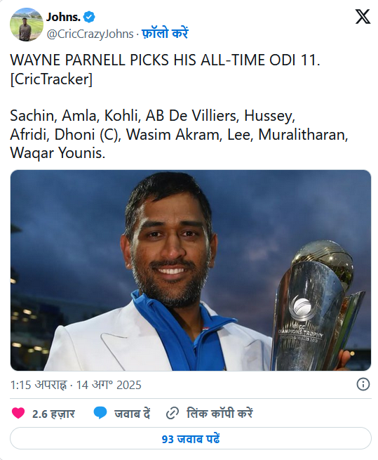 दक्षिण अफ्रीका के पूर्व तेज गेंदबाज वेन पार्नेल की ऑल-टाइम वनडे टीम में भारत, पाकिस्तान, ऑस्ट्रेलिया और दक्षिण अफ्रीका के दिग्गज शामिल