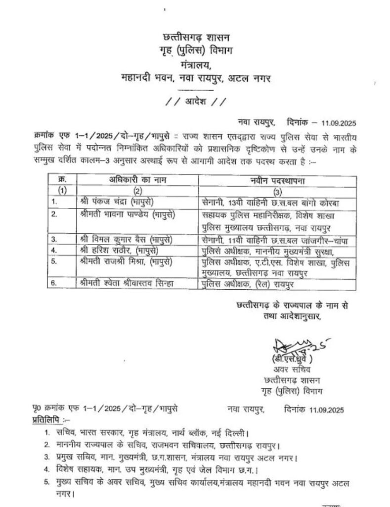 रायपुर ( शिखर दर्शन ) // छत्तीसगढ़ सरकार ने आईपीएस अधिकारियों के तबादले का आदेश जारी किया है। गृह (पुलिस) विभाग के अवर सचिव द्वारा जारी इस आदेश में कुल छह अधिकारियों के नाम शामिल किए गए हैं। इनमें आईपीएस पंकज चंद्रा, भावना पांडेय, विमल कुमार बैस, हरीश राठौर, राजश्री मिश्रा और श्वेता सिन्हा का नाम प्रमुख है।