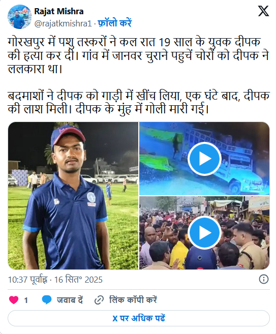 गोरखपुर ( शिखर दर्शन ) // उत्तर प्रदेश के मुख्यमंत्री योगी आदित्यनाथ के गृह जिले गोरखपुर से मानवता को शर्मसार करने वाली घटना सामने आई है। पिपराइच थाना क्षेत्र के जंगलधूसड़ गांव में सोमवार देर रात पशु तस्करों ने 19 वर्षीय नीट छात्र दीपक गुप्ता की बेरहमी से हत्या कर दी।