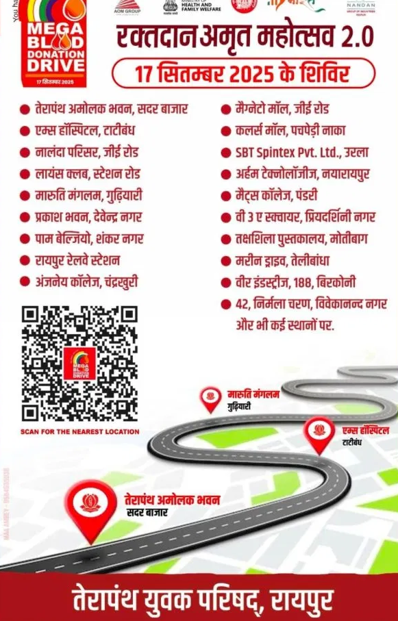 रायपुर (शिखर दर्शन) // अखिल भारतीय तेरापंथ युवक परिषद अपने 61वें स्थापना दिवस के अवसर पर 17 सितंबर को विश्वव्यापी मेगा रक्तदान शिविर आयोजित कर रही है। इस अभियान के तहत देशभर के शहरों और 50 से अधिक देशों में 7,500 से अधिक शिविर लगाए जाएंगे। छत्तीसगढ़ के सभी जिलों में भी विभिन्न स्थानों पर रक्तदान शिविर आयोजित होंगे।