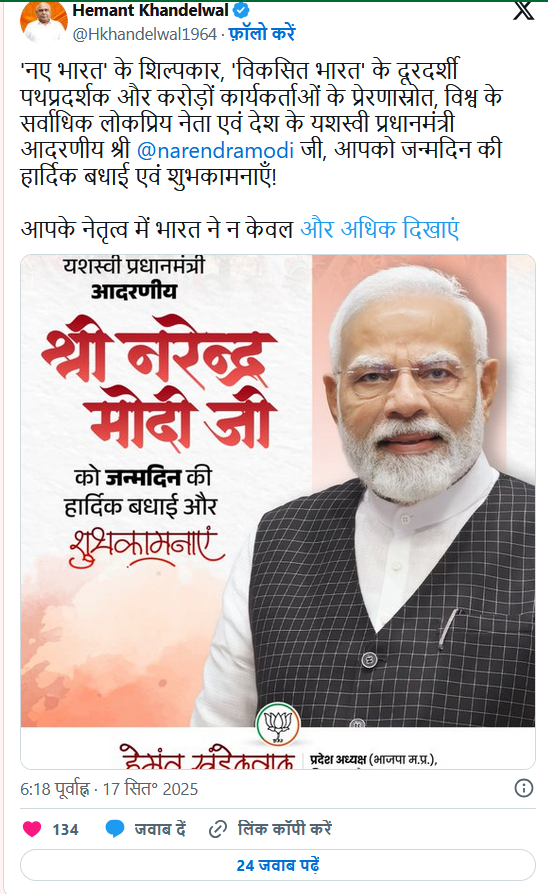 भाजपा प्रदेश अध्यक्ष हेमंत खंडेलवाल ने भी पीएम मोदी को शुभकामनाएं दी हैं। खंडेलवाल ने X पर लिखा कि नए भारत के शिल्पकार, विकसित भारत के दूरदर्शी पथप्रदर्शक और करोड़ों कार्यकर्ताओं के प्रेरणास्रोत, विश्व के सर्वाधिक लोकप्रिय नेता एवं देश के यशस्वी प्रधानमंत्री आदरणीय नरेंद्र मोदी जी, आपको जन्मदिन की हार्दिक बधाई एवं शुभकामनाएँ।