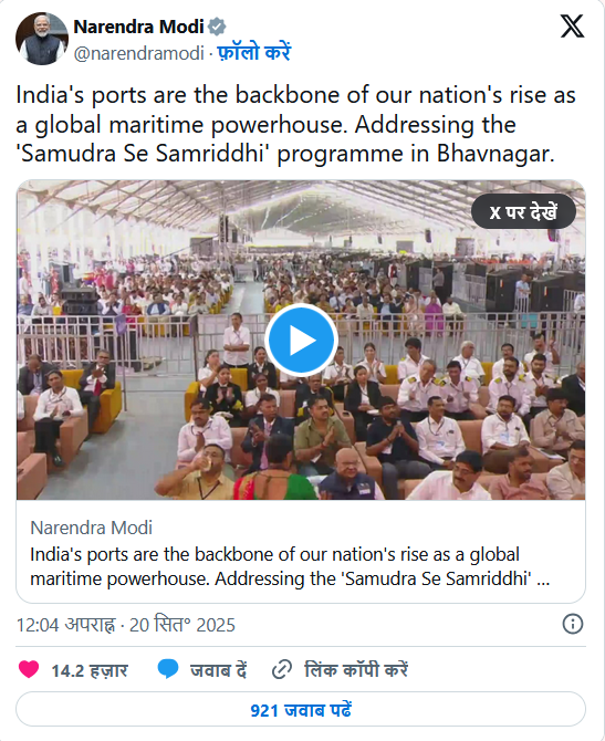 भावनगर ( शिखर दर्शन ) // प्रधानमंत्री नरेंद्र मोदी ने शनिवार को अपने गुजरात दौरे की शुरुआत भावनगर में भव्य रोड शो के साथ की। हजारों लोगों की मौजूदगी में पूरे शहर का माहौल देशभक्ति और उत्साह से गूंज उठा। इसके बाद गांधी मैदान में आयोजित कार्यक्रम में उन्होंने 34,200 करोड़ रुपये की विकास परियोजनाओं का उद्घाटन और शिलान्यास किया। इनमें ‘समुद्र से समृद्धि’ जैसी अहम योजनाएं भी शामिल हैं।