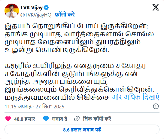 अभिनेता विजय ने सोशल मीडिया प्लेटफॉर्म एक्स पर अपने पहले रिएक्शन में इस दुखद घटना पर गहरा शोक व्यक्त किया। उन्होंने लिखा, “मेरा दिल टूट गया है। मैं असहनीय, अवर्णनीय दर्द और शोक में तड़प रहा हूं, जिसे शब्दों में व्यक्त नहीं किया जा सकता। करूर में अपनी जान गंवाने वाले मेरे प्यारे भाइयों और बहनों के परिवारों के प्रति मैं अपनी गहरी संवेदना और सहानुभूति व्यक्त करता हूं। मैं अस्पताल में इलाज करा रहे लोगों के जल्द स्वस्थ होने की प्रार्थना करता हूं।”