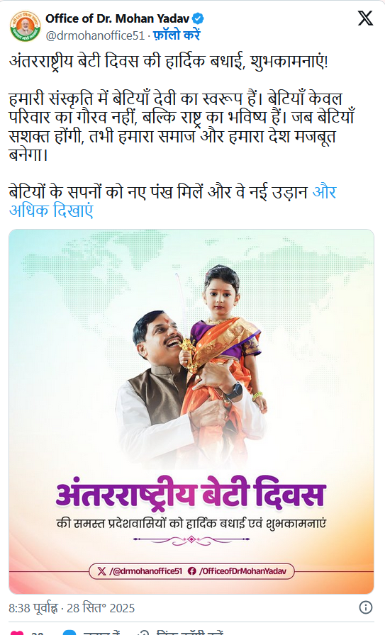डॉ. यादव ने अपने आधिकारिक एक्स (X) पेज पर संदेश जारी करते हुए लिखा – “अंतरराष्ट्रीय बेटी दिवस की हार्दिक बधाई एवं शुभकामनाएं! बेटियों के सपनों को नई उड़ान देने के लिए सरकार संकल्पबद्ध है।”