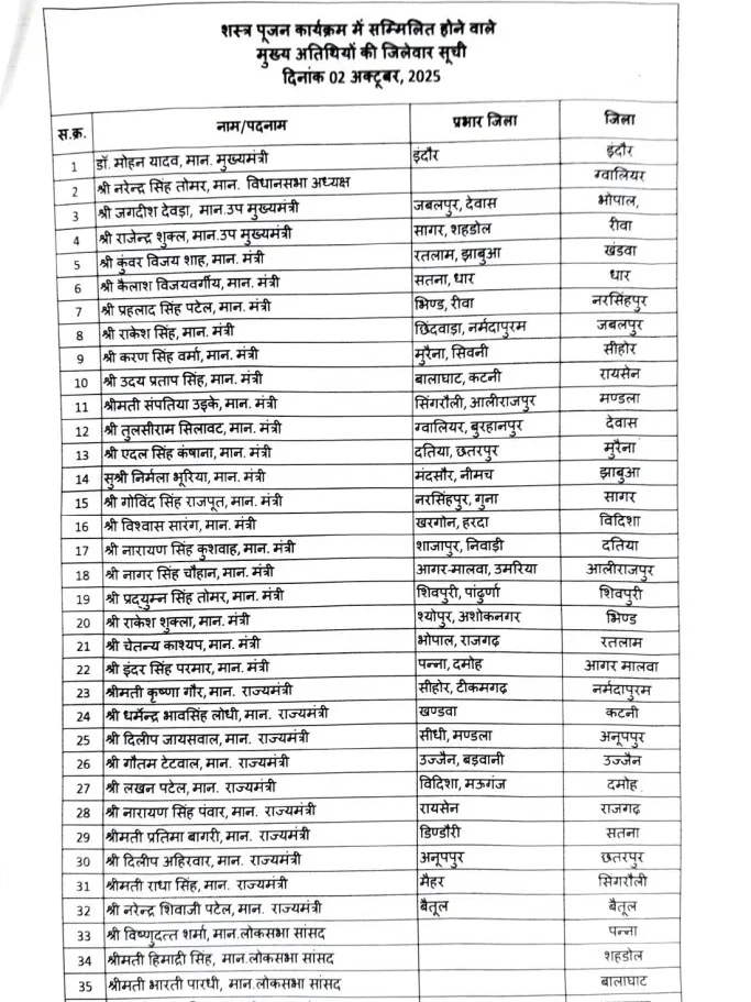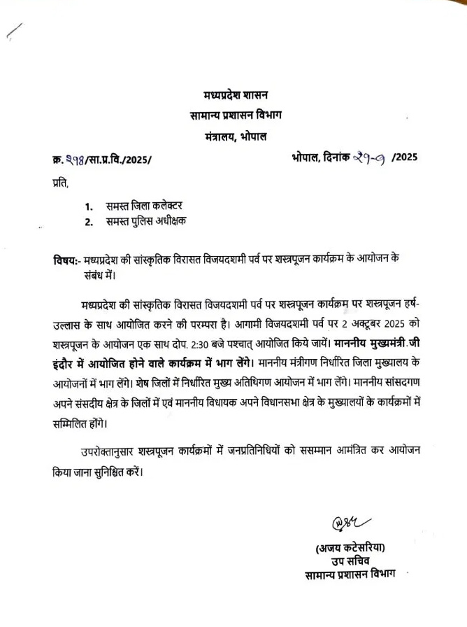दशहरा 2025: मध्य प्रदेश में सभी जिलों में शस्त्र पूजन कार्यक्रम, CM डॉ. मोहन इंदौर में करेंगे पूजा, मंत्री-सांसद-विधायक रहेंगे मौजूद , आदेश जारी
