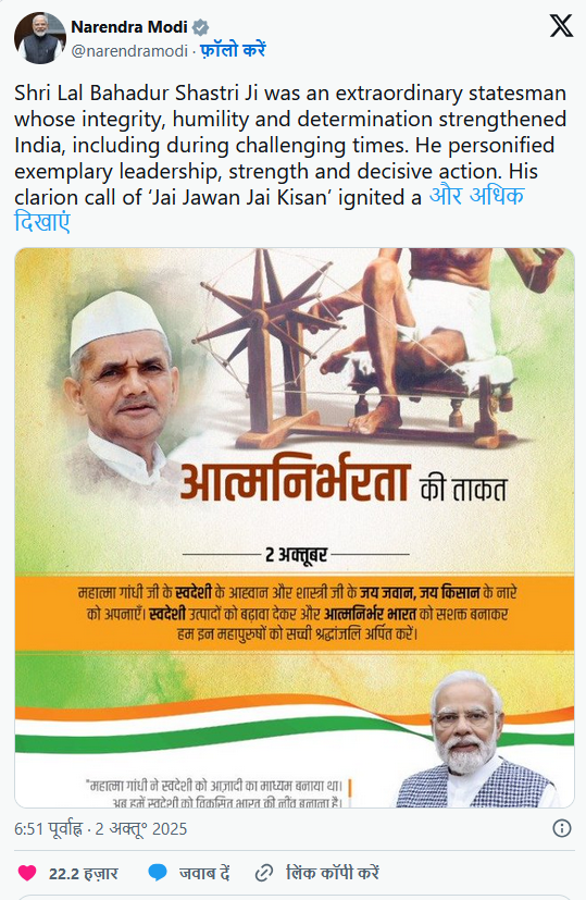 पूर्व प्रधानमंत्री लाल बहादुर शास्त्री को याद करते हुए उन्होंने कहा कि शास्त्री जी की ईमानदारी, विनम्रता और दृढ़ संकल्प ने भारत को चुनौतीपूर्ण समय में भी सशक्त बनाया। ‘जय जवान, जय किसान’ के उनके आह्वान ने देशवासियों में देशभक्ति की भावना जगाई और वे आज भी एक आत्मनिर्भर भारत के निर्माण के लिए प्रेरित करते हैं।