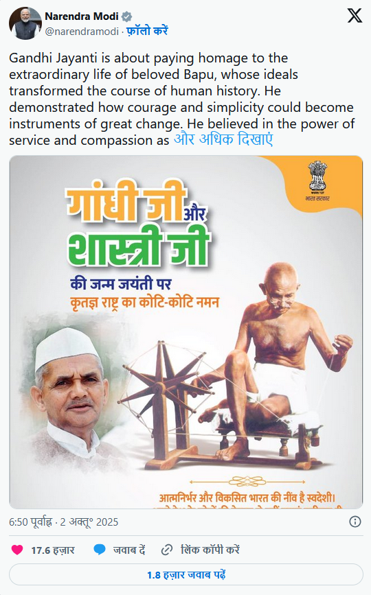 पीएम मोदी ने महात्मा गांधी को याद करते हुए सोशल मीडिया पर लिखा कि गांधी जी का जीवन साहस और सादगी की मिसाल है, जिन्होंने सेवा और करुणा के माध्यम से लोगों को सशक्त बनाने का मार्ग दिखाया। उन्होंने कहा कि हम एक विकसित भारत के निर्माण के अभियान में उनके बताए मार्ग पर चलते रहेंगे।
