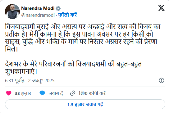 इसके साथ ही प्रधानमंत्री मोदी ने विजयादशमी के अवसर पर देशवासियों को शुभकामनाएं दीं। उन्होंने लिखा कि विजयादशमी बुराई पर अच्छाई और असत्य पर सत्य की विजय का प्रतीक है। उन्होंने सभी से साहस, बुद्धि और भक्ति के मार्ग पर अग्रसर रहने की प्रेरणा लेने की कामना की।