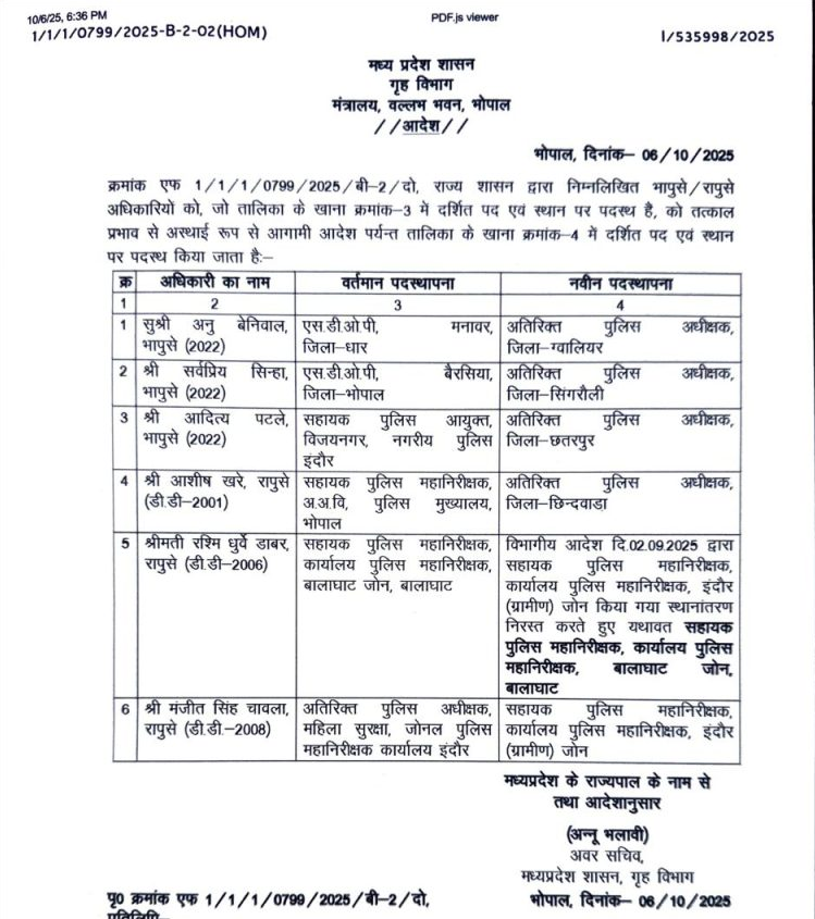 Transfer Breaking: मध्यप्रदेश पुलिस विभाग में बड़ा फेरबदल, 6 अफसरों का तबादला — 3 आईपीएस और 3 राज्य पुलिस सेवा के अधिकारी बदले गए