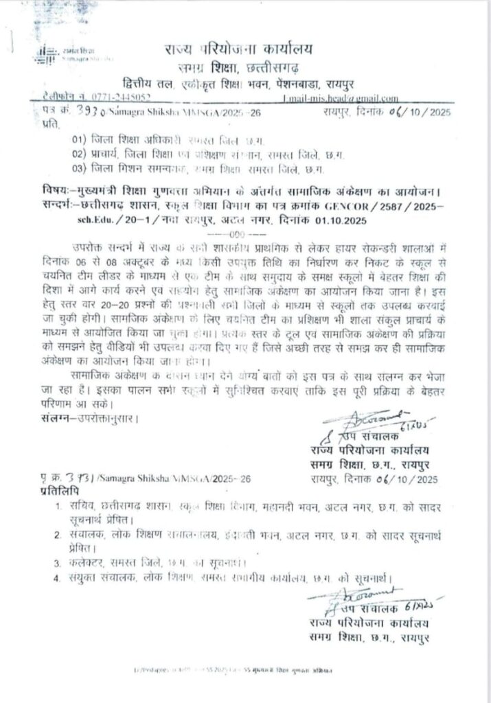 राज्य परियोजना कार्यालय, समग्र शिक्षा छत्तीसगढ़ की ओर से जारी निर्देशों में सभी जिला शिक्षा अधिकारियों, प्राचार्यों और जिला मिशन समन्वयकों को स्पष्ट दिशानिर्देश दिए गए हैं। निर्देशों के अनुसार, प्रत्येक स्कूल में निकटवर्ती विद्यालय के टीम लीडर के नेतृत्व में एक टीम गठित कर समुदाय के समक्ष सामाजिक अंकेक्षण किया जाएगा, ताकि शिक्षा की गुणवत्ता और पारदर्शिता को सुदृढ़ किया जा सके।