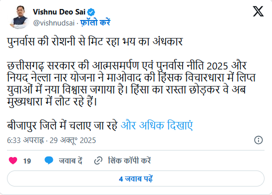 मुख्यमंत्री साय ने लिखा — “राज्य सरकार की ‘आत्मसमर्पण एवं पुनर्वास नीति 2025’ और ‘नियद नेल्ला नार योजना’ ने बस्तर अंचल में नई दिशा दी है। इन नीतियों के परिणामस्वरूप माओवाद की हिंसक विचारधारा में फंसे युवाओं में विश्वास जगा है और वे अब मुख्यधारा में लौटकर विकास की ओर कदम बढ़ा रहे हैं।”