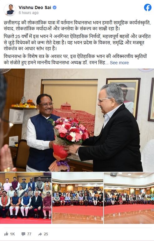 मुख्यमंत्री साय ने लिखा कि छत्तीसगढ़ की लोकतांत्रिक यात्रा में वर्तमान (पुराना) विधानसभा भवन ने 25 वर्षों के दौरान अनगिनत ऐतिहासिक निर्णयों, महत्वपूर्ण बहसों और जनहित से जुड़े विधेयकों को जन्म लेते देखा है। यह भवन केवल एक संरचना नहीं, बल्कि राज्य के विकास, सुशासन और मजबूत लोकतांत्रिक परंपराओं का आधार स्तंभ रहा है।