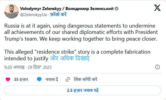 यूक्रेनी राष्ट्रपति जेलेंस्की ने रूसी दावे को पूरी तरह झूठा और मनगढ़ंत बताया। उन्होंने कहा कि रूस इस तरह की कहानियां गढ़कर कीव में सरकारी इमारतों पर हमले का बहाना बना रहा है। जेलेंस्की ने एक्स पर लिखा कि यूक्रेन हमेशा कूटनीतिक समाधान के पक्ष में रहा है, जबकि रूस युद्ध समाप्त करने के जरूरी कदम उठाने से इनकार कर रहा है। उन्होंने चेतावनी दी कि यूक्रेन और अंतरराष्ट्रीय समुदाय रूस को स्थायी शांति के प्रयासों को कमजोर करने की अनुमति नहीं देंगे।