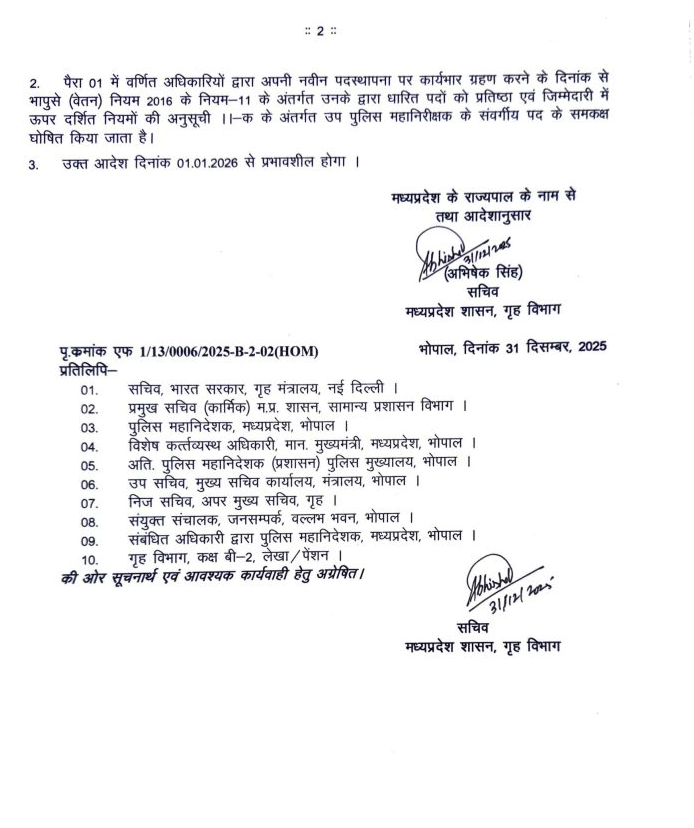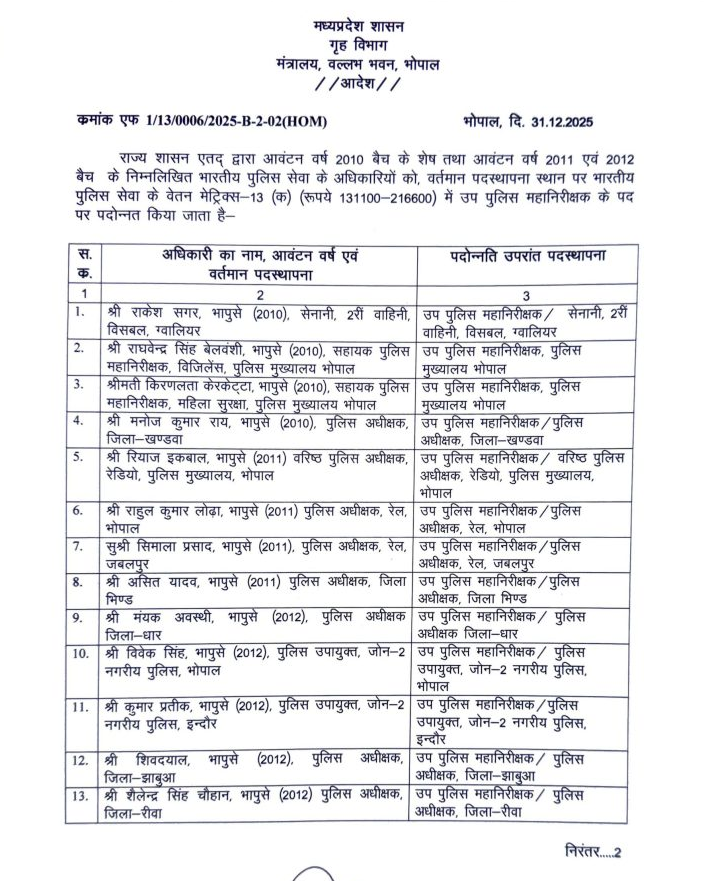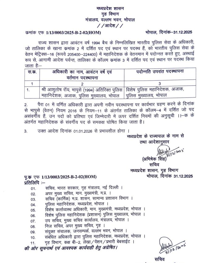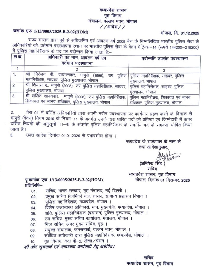 मध्य प्रदेश में नए साल से पहले IPS अफसरों को बड़ा तोहफा: दर्जनों अधिकारियों को पदोन्नति, स्पेशल डीजी और ADG बनाए गए