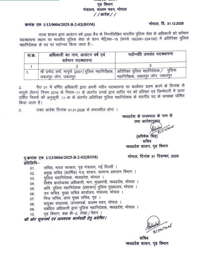 - प्रमोद वर्मा, जो पहले जबलपुर जोन के IG थे, उन्हें जबलपुर जोन का ADG नियुक्त किया गया।