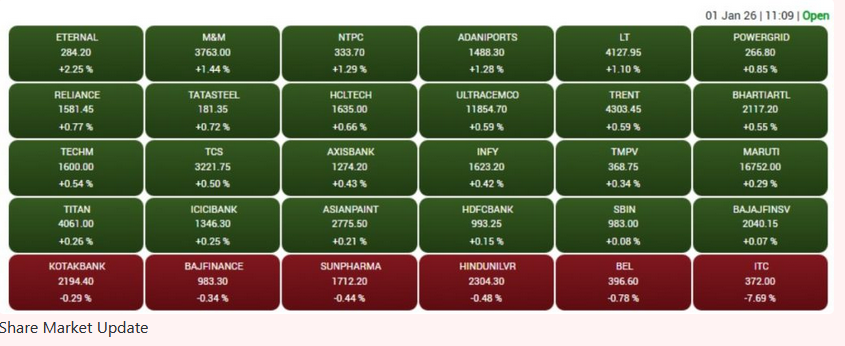 मुंबई (शिखर दर्शन) // नए साल के पहले दिन गुरुवार, 1 जनवरी 2026 को शेयर बाजार में हल्की तेजी देखने को मिली। बीएसई का सेंसेक्स 85,348.62 के स्तर पर ट्रेड कर रहा है, जिसमें +128.02 (0.15%) अंकों की बढ़त दर्ज की गई। वहीं, निफ्टी 26,163.55 पर पहुंचा, जो +33.95 (0.13%) अंक ऊपर है।