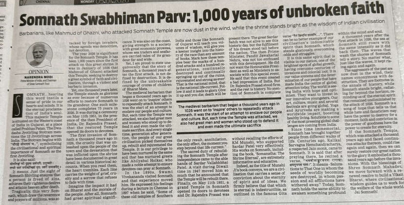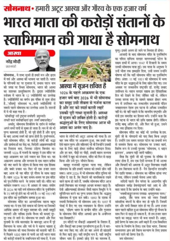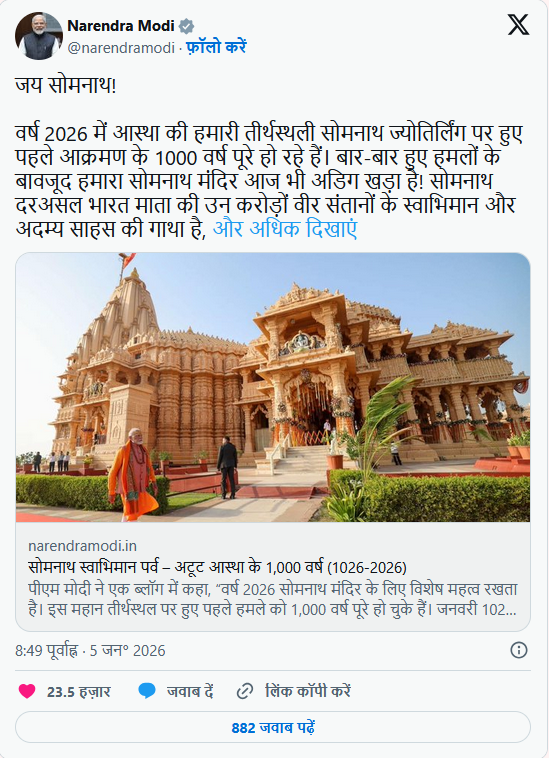 प्रधानमंत्री ने लिखा कि अतीत के आक्रमणकारी अब इतिहास के फुटनोट बन चुके हैं, जबकि सोमनाथ आज भी भारत की आत्मा के रूप में प्रकाश फैला रहा है