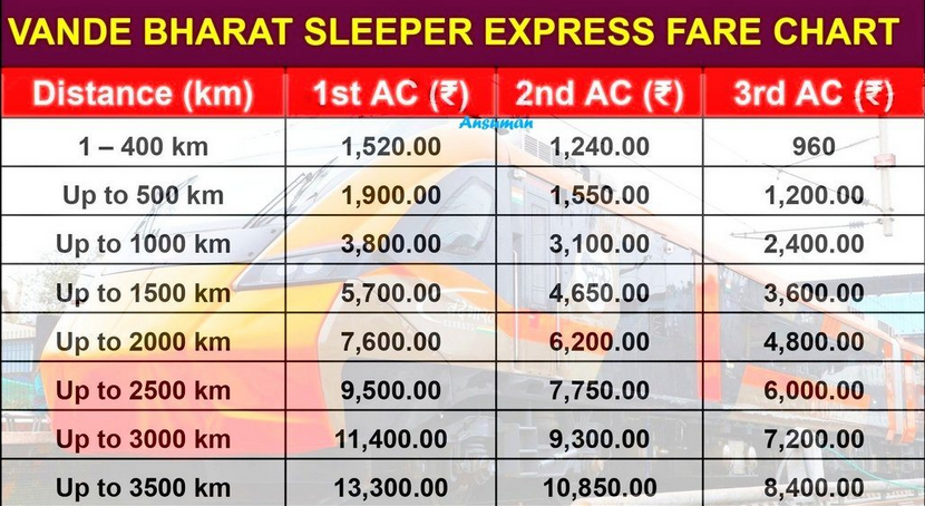 वंदे भारत स्लीपर का किराया सामान्य ट्रेनों से अधिक रखा गया है। न्यूनतम 400 किलोमीटर की दूरी का चार्ज तय किया गया है, चाहे आप उससे कम दूरी तय करें। 3AC में सफर के लिए करीब 2.40 रुपये प्रति किलोमीटर, 2AC के लिए 3.10 रुपये प्रति किलोमीटर और 1AC के लिए 3.80 रुपये प्रति किलोमीटर का किराया रहेगा। इसके अलावा AC क्लास पर GST अलग से लागू होगा।