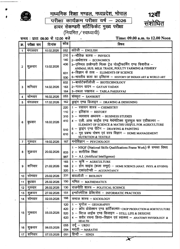 एमपी बोर्ड की 10वीं कक्षा की परीक्षा 13 फरवरी से 6 मार्च 2026 तक आयोजित की जाएगी, जबकि 12वीं कक्षा की परीक्षा 10 फरवरी से 7 मार्च 2026 तक होगी। सभी परीक्षाएं सुबह 9 बजे से दोपहर 12 बजे तक संपन्न होंगी।
