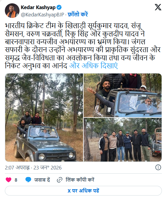 इस जंगल भ्रमण की तस्वीरें वन एवं जलवायु परिवर्तन मंत्री केदार कश्यप ने अपने सोशल मीडिया अकाउंट पर साझा की हैं। तस्वीरों में भारतीय टी20 टीम के कप्तान सूर्यकुमार यादव के साथ संजू सैमसन, वरुण चक्रवर्ती, रिंकू सिंह और कुलदीप यादव अभयारण्य की हरियाली और वन्यजीवों के बीच नजर आ रहे हैं।