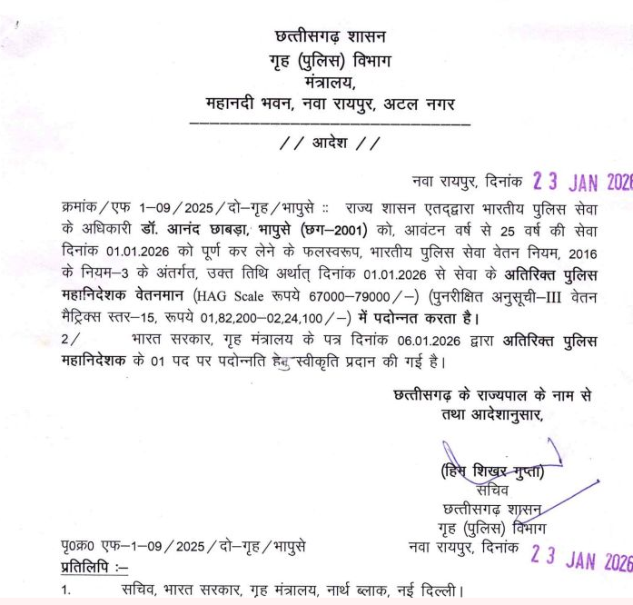 राज्य कैडर के आईपीएस अधिकारी डॉ. आनंद छाबड़ा (भापुसे–2001) को 25 वर्ष की सेवा पूर्ण होने के उपरांत अतिरिक्त पुलिस महानिदेशक के पद पर पदोन्नत किया गया है। इस पदोन्नति के लिए भारत सरकार के गृह मंत्रालय से 6 जनवरी 2026 को स्वीकृति प्राप्त हुई थी।