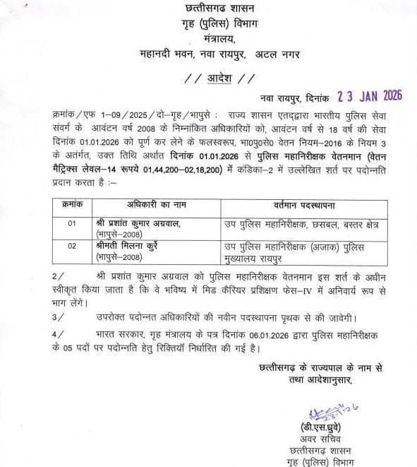 आवंटन वर्ष 2008 के दो आईपीएस अधिकारियों—प्रशांत कुमार अग्रवाल और मिलना कुर्रे को पुलिस महानिरीक्षक (IG) के पद पर पदोन्नत किया गया है। आदेश में यह भी उल्लेख है कि प्रशांत कुमार अग्रवाल को भविष्य में मिड करियर प्रशिक्षण (Phase-IV) में अनिवार्य रूप से भाग लेना होगा। पदोन्नत अधिकारियों की नई पदस्थापना के आदेश अलग से जारी किए जाएंगे।