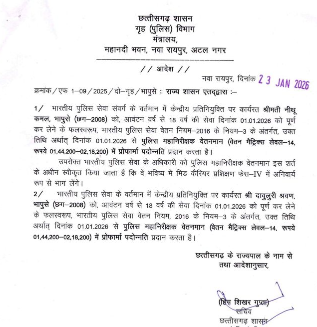 साथ ही, केंद्रीय प्रतिनियुक्ति पर कार्यरत वर्ष 2008 बैच की अधिकारी नीथू कमल और दावुलुरी श्रवण को 1 जनवरी 2026 से पुलिस महानिरीक्षक वेतनमान में प्रोफार्मा पदोन्नति दी गई है।