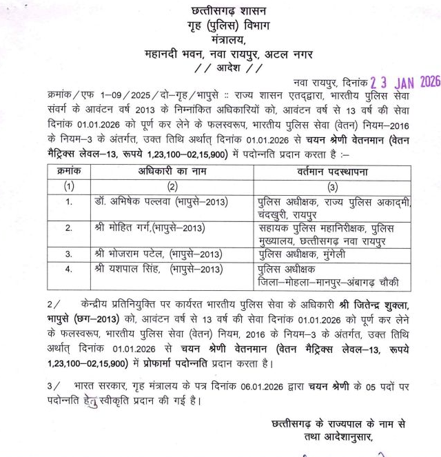रायपुर ( शिखर दर्शन ) // छत्तीसगढ़ शासन के गृह (पुलिस) विभाग ने भारतीय पुलिस सेवा (आईपीएस) के अधिकारियों की पदोन्नति को लेकर महत्वपूर्ण आदेश जारी किया है। विभिन्न बैच के अधिकारियों को उनके अनुभव और सेवा अवधि के आधार पर उच्च पदों पर पदोन्नत किया गया है।