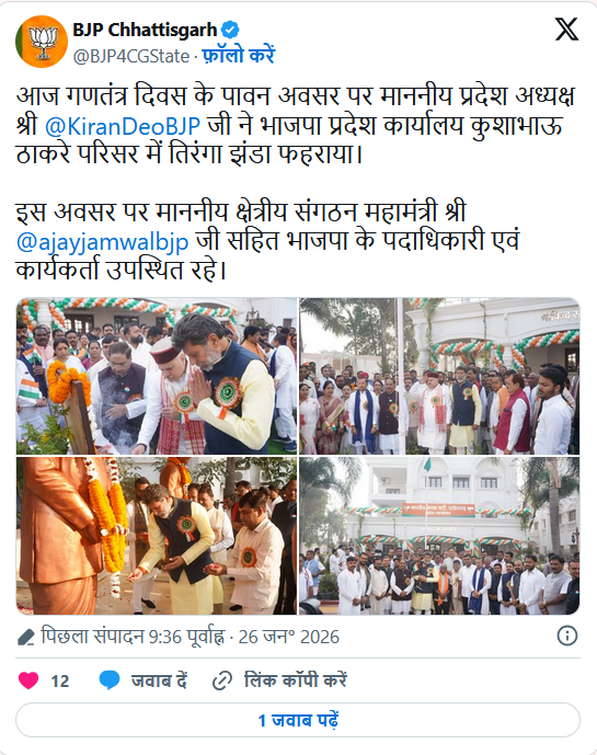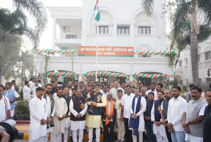बीजेपी प्रदेश कार्यालय में 77वां गणतंत्र दिवस, प्रदेश अध्यक्ष किरण सिंह देव ने तिरंगा फहराया