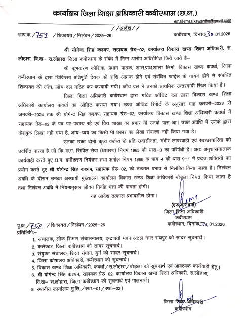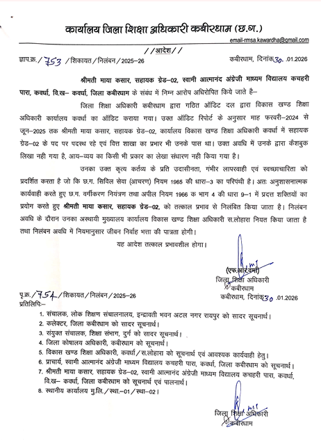कवर्धा ( शिखर दर्शन ) // कबीरधाम जिले के शिक्षा विभाग में कथित 218 करोड़ रुपये की वित्तीय अनियमितताओं के मामले में जिला प्रशासन ने कड़ा कदम उठाते हुए दो कर्मचारियों को निलंबित कर दिया है। निलंबन आदेश में तत्कालीन कार्यालय में पदस्थ रहे वर्ग–2 कर्मचारी माया कसार और कक्ष प्रभारी योगेंद्र कश्यप को शामिल किया गया है। निलंबन अवधि के दौरान दोनों कर्मचारियों को जीवन निर्वाह भत्ता दिया जाएगा।