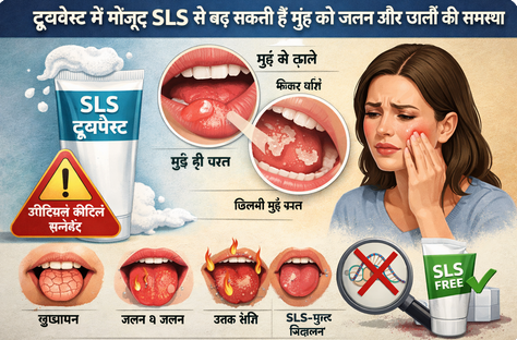 टूथपेस्ट में इस्तेमाल होने वाला सोडियम लॉरिल सल्फेट (SLS) एक सामान्य फोम बनाने वाला तत्व है, जो ब्रश करते समय झाग उत्पन्न करता है। हालांकि, हाल के वर्षों में यह पाया गया है कि SLS कुछ लोगों में मुंह से जुड़ी समस्याओं का कारण बन सकता है। विशेष रूप से संवेदनशील मसूड़ों या नाजुक मौखिक ऊतकों वाले व्यक्तियों में इसके दुष्प्रभाव अधिक देखे गए हैं।