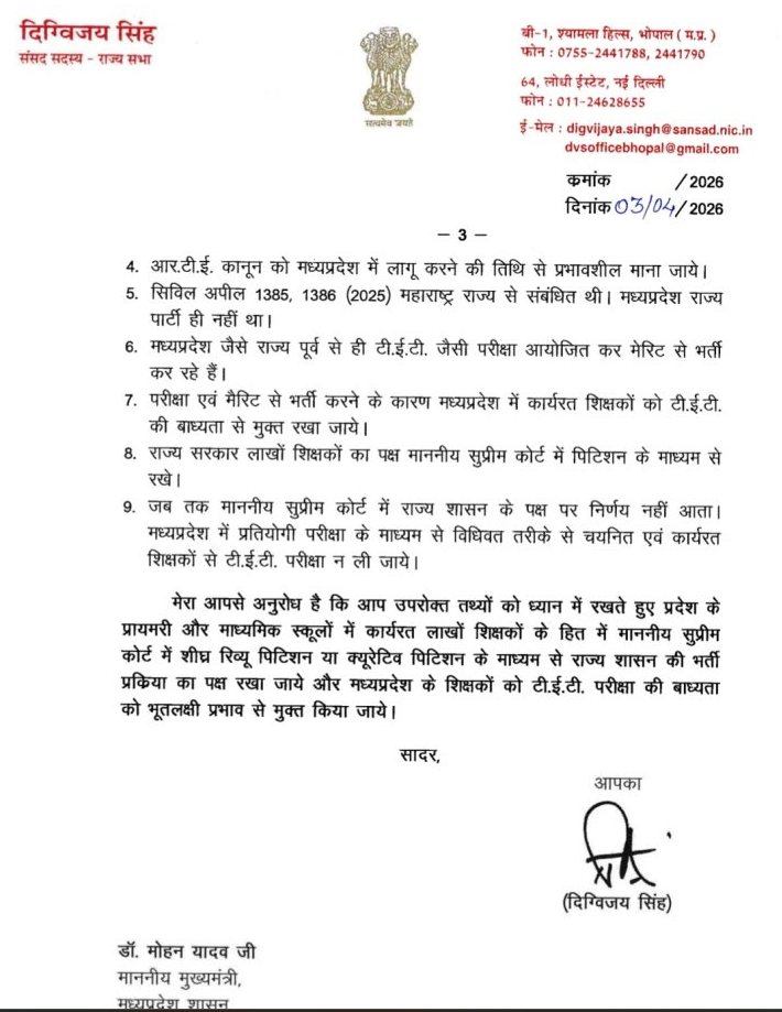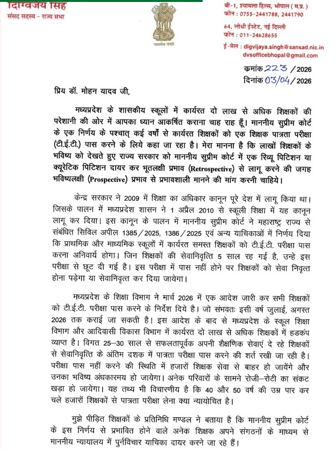 दिग्विजय सिंह ने अपने पत्र में कहा कि TET नियम को भूतलक्षी (रेट्रोस्पेक्टिव) प्रभाव से लागू करना उचित नहीं है। उन्होंने सरकार से आग्रह किया कि इसे भविष्यलक्षी (प्रोस्पेक्टिव) रूप से लागू किया जाए, ताकि पहले से कार्यरत शिक्षकों पर इसका नकारात्मक प्रभाव न पड़े।