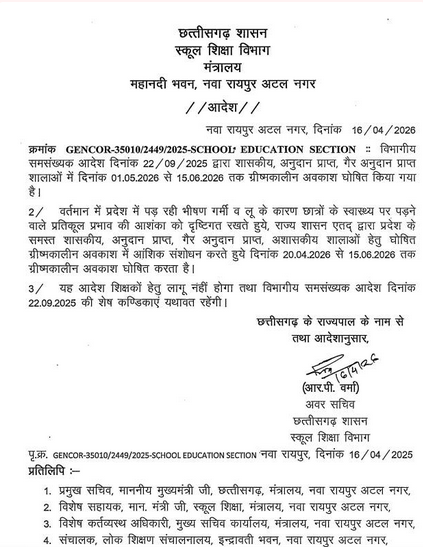 स्कूल शिक्षा विभाग द्वारा जारी आदेश के अनुसार यह अवकाश प्रदेश के सभी शासकीय, अनुदान प्राप्त, गैर अनुदान प्राप्त और निजी विद्यालयों पर समान रूप से लागू होगा। इससे पहले ग्रीष्मकालीन अवकाश 1 मई से 15 जून तक निर्धारित था, जिसे संशोधित कर अग्रिम कर दिया गया है।