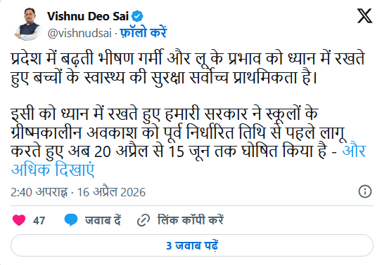 मुख्यमंत्री ने बताया कि प्रदेश में तापमान 42 डिग्री सेल्सियस तक पहुंच चुका है और आगामी दिनों में इसमें 2 से 3 डिग्री तक और वृद्धि होने की संभावना है। ऐसे में लू और गर्मी के दुष्प्रभाव से बच्चों को बचाने के लिए पूर्व निर्धारित तिथि से पहले ही अवकाश लागू करने का निर्णय लिया गया है। अब प्रदेश में 20 अप्रैल से 15 जून 2026 तक स्कूल बंद रहेंगे।