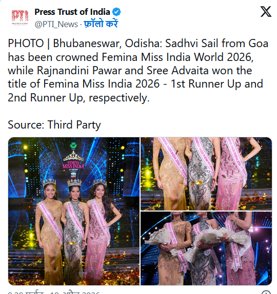 भुवनेश्वर ( शिखर दर्शन ) // फेमिना मिस इंडिया 2026 का खिताब गोवा की साध्वी सतीश सैल ने अपने नाम कर लिया है। भुवनेश्वर स्थित कलिंगा इंस्टीट्यूट ऑफ इंडस्ट्रियल टेक्नोलॉजी में आयोजित ग्रैंड फिनाले में साध्वी ने 30 प्रतिभागियों को पीछे छोड़ते हुए यह प्रतिष्ठित ताज हासिल किया। जैसे ही उनके नाम की घोषणा हुई, पूरा हॉल तालियों की गूंज से भर गया और साध्वी की आंखों में खुशी के आंसू छलक पड़े।