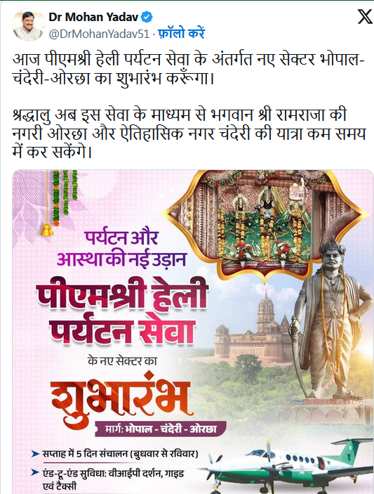 पीएमश्री हेली पर्यटन सेवा शुरू: भोपाल-चंदेरी-ओरछा सेक्टर का शुभारंभ