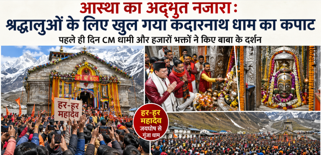 केदारनाथ ( शिखर दर्शन ) // हिमालय की गोद में बसे भगवान केदारनाथ धाम के कपाट श्रद्धालुओं के लिए विधि-विधान के साथ खोल दिए गए। मंगलवार सुबह वैदिक मंत्रोच्चार और धार्मिक अनुष्ठानों के बीच जैसे ही मंदिर के द्वार खुले, पूरा परिसर “हर-हर महादेव” के जयघोष से गूंज उठा। इस पावन अवसर पर मुख्यमंत्री पुष्कर सिंह धामी ने भी बाबा केदार के दर्शन कर प्रदेश और देश की सुख-समृद्धि की कामना की।