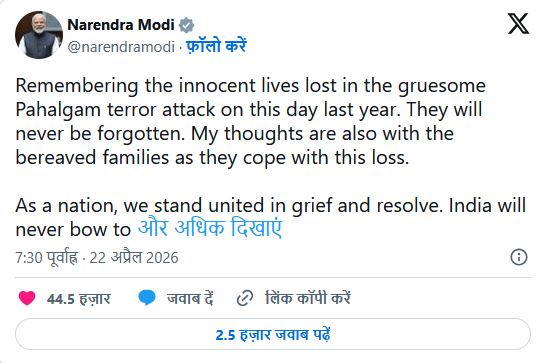 प्रधानमंत्री ने सोशल मीडिया पर अपने संदेश में कहा कि पहलगाम में हुए उस दर्दनाक हमले के पीड़ितों को आज पूरा देश याद कर रहा है। उन्होंने शोक संतप्त परिवारों के प्रति संवेदना व्यक्त करते हुए लिखा कि इस दुख की घड़ी में पूरा देश उनके साथ खड़ा है। साथ ही स्पष्ट किया कि भारत किसी भी प्रकार के आतंकवाद के आगे झुकने वाला नहीं है और आतंकियों के मंसूबे कभी सफल नहीं होंगे।