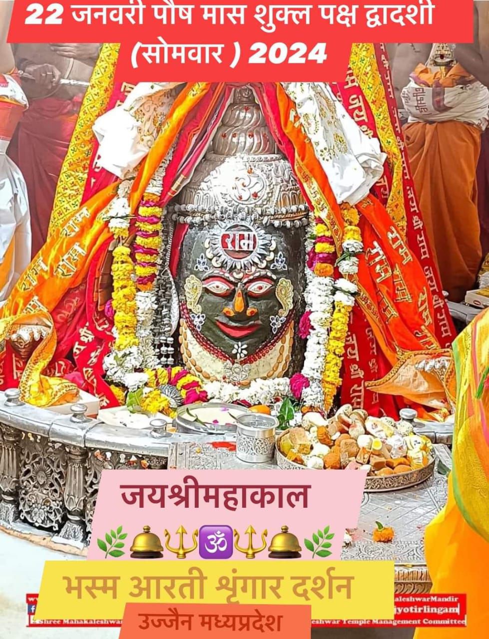 श्री महाकाल को भस्म चढ़ाई गई । बाबा ने शेष नाग का रजत मुकुट , रजत मुंडो की माला , रुद्राक्ष की माला के साथ सुगंधित फूलों की माला धारण की । श्री महाकाल को श्री रामलला के प्राण प्रतिष्ठा के पावन दिवस के उपलक्ष में श्री राम रूपी दिव्य श्रृंगार किया गया । बाबा को विभिन्न प्रकार के फलों एवम मिठाइयों का भोग लगाया गया ।