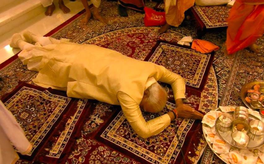 प्रधानमंत्री नरेंद्र मोदी ने श्री राम जन्मभूमि मंदिर में रामलला के प्राण प्रतिष्ठा उपरांत उनकी भव्य आरती की ।इसके बाद प्रधानमंत्री ने भगवान रामलला को दंडवत प्रणाम किया ।