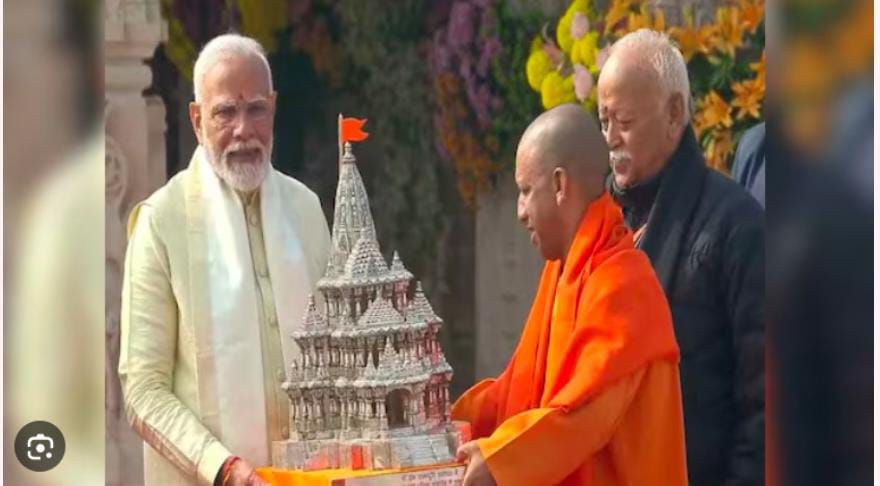 उत्तर प्रदेश के मुख्यमंत्री योगी आदित्यनाथ ने श्री राम मंदिर में प्रधानमंत्री नरेंद्र मोदी को अयोध्या के श्री राम मंदिर का मॉडल भेंट किया।