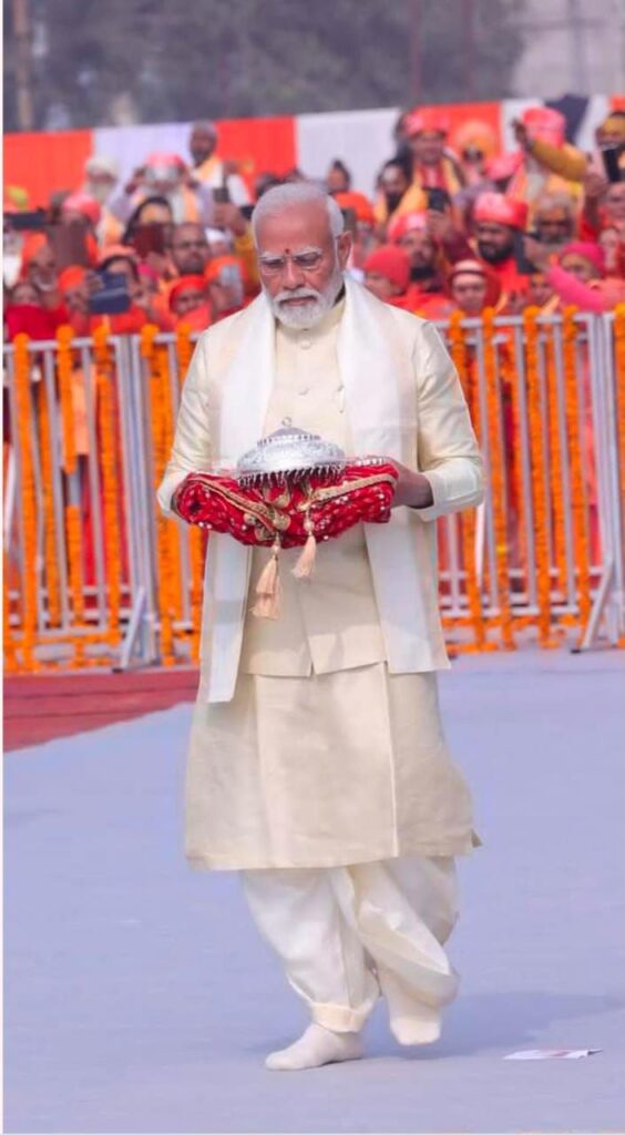 जैसे ही प्रधानमंत्री मोदी श्री राम मंदिर परिसर में कदम रखे उनके हाथों में रामलला के लिए उपहार स्वरूप चांदी का छत्र देखा गया । जिसे लेकर पीएम गर्भगृह में प्रवेश करे । इसके बाद प्राण प्रतिष्ठा के लिए संकल्प लिया ।