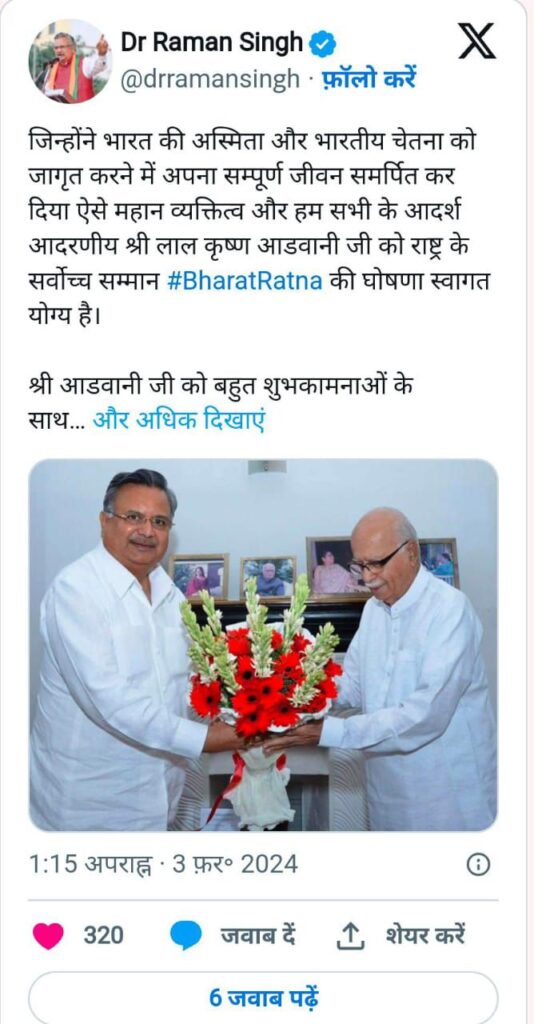 डॉ रमन सिंह ने x में किए गए अपने पोस्ट में कहा है कि “भारत की अस्मिता और भारतीय चेतना को जागृत करने में अपना संपूर्ण जीवन समर्पित करने वाले महान व्यक्तित्व और हम सभी के आदर्श लाल कृष्ण आडवाणी को राष्ट्र के सर्वोच्च सम्मान “भारत रत्न” देने की घोषणा स्वागत योग्य है । उनके कार्य और विचार हम सभी को राष्ट्र सेवा हेतु प्रेरित करते हैं ।मां भारती के समर्पित सपूत आडवाणी इस सम्मान के सच्चे अधिकारी हैं”